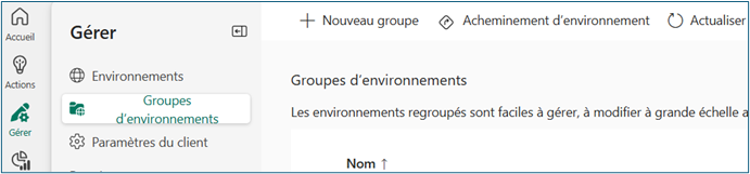 1. Accéder à un groupe d’environnement en allant dans la section « Gérer » puis « Groupes d’environnements » dans le bandeau latéral de gauche.