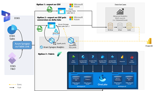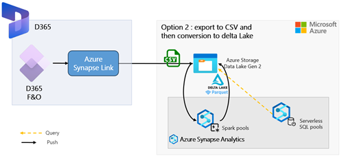 | Synapse Link pour D365 avec conversion Delta Lake + Synapse Serverless | La fraîcheur des données dépend de la configuration de la conversion | Élevée (Spark Pool, orchestration, gouvernance Delta) | Spark Pool + Serverless | Excellente (performances optimisées, ACID, partitionnement) |
