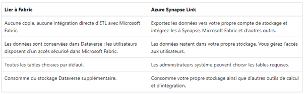 | Fabric Link (OneLake) | Quasi temps réel (15min) (intégration native) | Faible (activation Link, configuration Fabric) | capacité Fabric | Excellente (Power BI intégré, Lakehouse, Data Warehouse) |