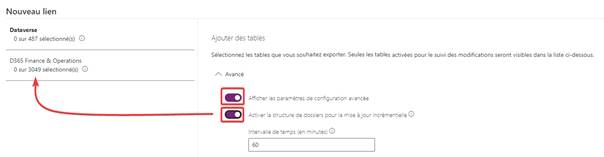 Vous devez afficher les paramètres avancés, puis cocher les deux options ci-dessous. Ce n’est qu’à ce moment-là que les tables D365 f&O seront disponibles pour le synapse link.