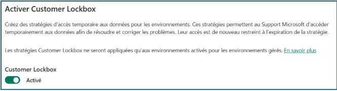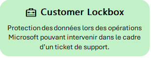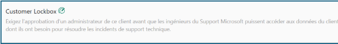 Customer Lockbox permet de restreindre l’accès aux données des environnements par Microsoft. Si une intervention de Microsoft est nécessaire dans le cadre d’un ticket de support, une demande d’accès devra être approuvée avant toute action.