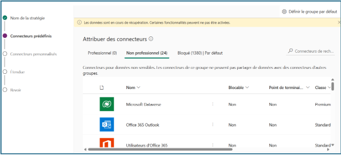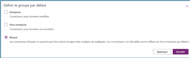 Notre recommandation est d’activer une stratégie globale pour bloquer tous les connecteurs inutilisés dans tous les environnements afin de prévenir la perte de données. Ensuite, il est conseillé d’établir des règles spécifiques pour chaque environnement ou groupe d’environnement.