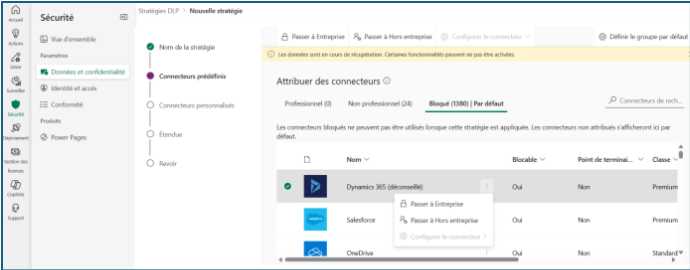 - Parmi les connecteurs bloqués, sélectionner ceux que vous souhaitez ajouter à la catégorie « Professionnel » ou « Non professionnel » afin de définir votre stratégie.