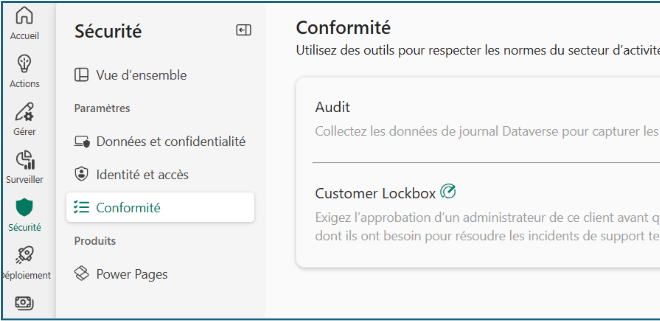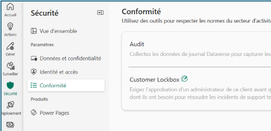 Microsoft Power Platform propose diverses fonctionnalités pour sécuriser les données et assurer la conformité via le menu « Sécurité ». Voici les fonctionnalités disponibles :