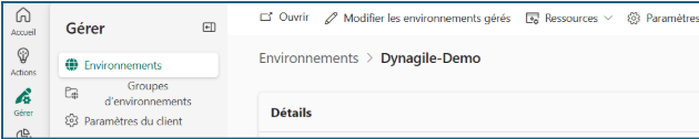 - Accéder aux journaux en sélectionnant l’environnement souhaité depuis le menu « Gérer » dans le bandeau latéral gauche.
