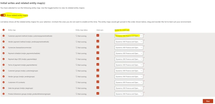 The initial write open, and click on “Show Related Entity map(s)” , so that CDS will sync also related entity based on the product. Don’t forget also to check your Master for Initial Sync. Like me my FinOps is my MASTER source of my Data so I prefer to set it like this. Of course it won’t erase previous data from your CRM instance if you had some before.