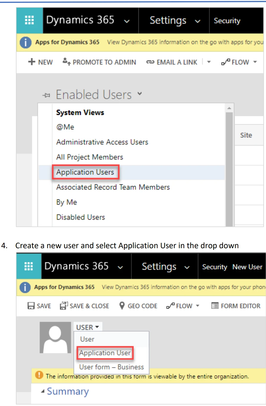 2. Switch to Application Users and create new Users (don’t forget to switch after the form to : Application user)