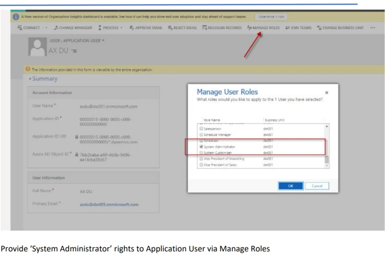 3. Provide ‘System Administrator’ rights to Application User via Manage Roles