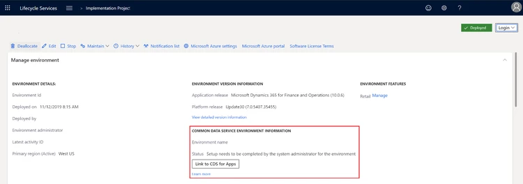 - An admin of the Finance and Operations environment must sign in to LCS and select Link to CDS for Apps to complete the link. The environment details page shows the admin’s contact information.After the link is completed, the status is updated to Environment linking successfully completed.