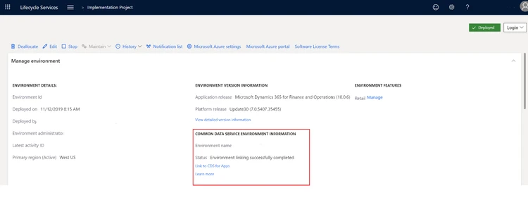- After the environment has a status of Deployed, open the environment details page. The Common Data Service environment information section shows the names of the Finance and Operations environment and the Common Data Service environment that are linked.