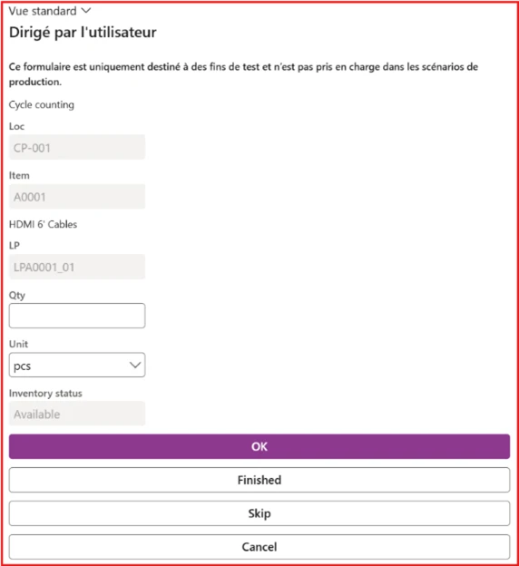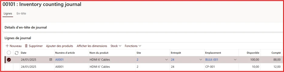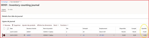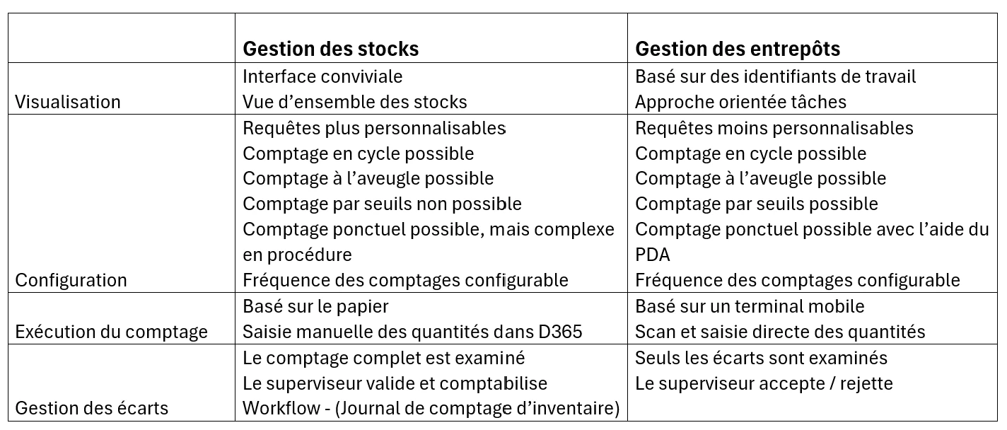 Dans le module Gestion des stocks, les quantités étant saisies manuellement dans le système, les écarts sont déjà examinés et validés par le gestionnaire lors de l’enregistrement du comptage dans D365.