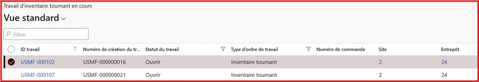 Dans le module Gestion des entrepôts, puisque les comptages sont générés sous forme de tâches à effectuer par les opérateurs, vous verrez deux tâches de travail créées (une par emplacement). Toutefois, les informations derrière les identifiants de travail ne sont pas immédiatement accessibles :
