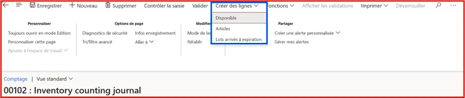 Trois options sont disponibles pour créer vos journaux et configurer une requête personnalisée. Une fois le journal créé (Gestion des stocks → Entrées de journal → Inventaire des articles → Comptage), cliquez sur le menu déroulant « Créer des lignes » :