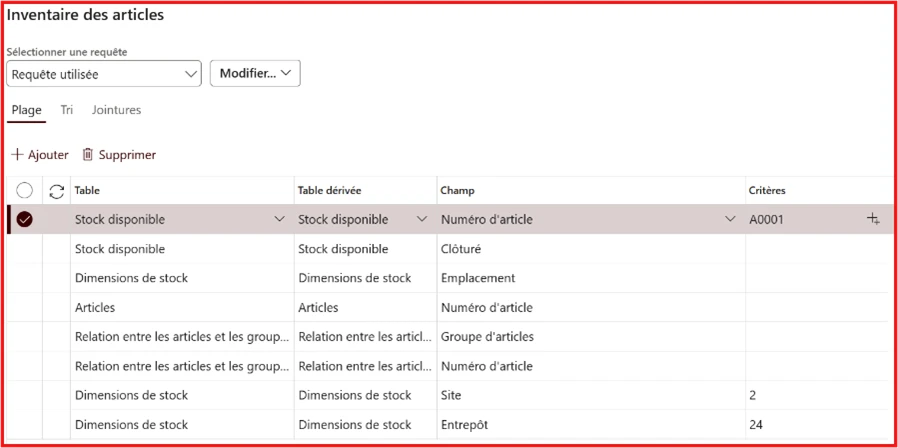 Chaque option ouvre un écran permettant de configurer votre comptage, y compris les requêtes nécessaires pour identifier les articles et leurs emplacements respectifs. Voici un exemple de comptage pour l’article A0001, site 2, entrepôt 24 :