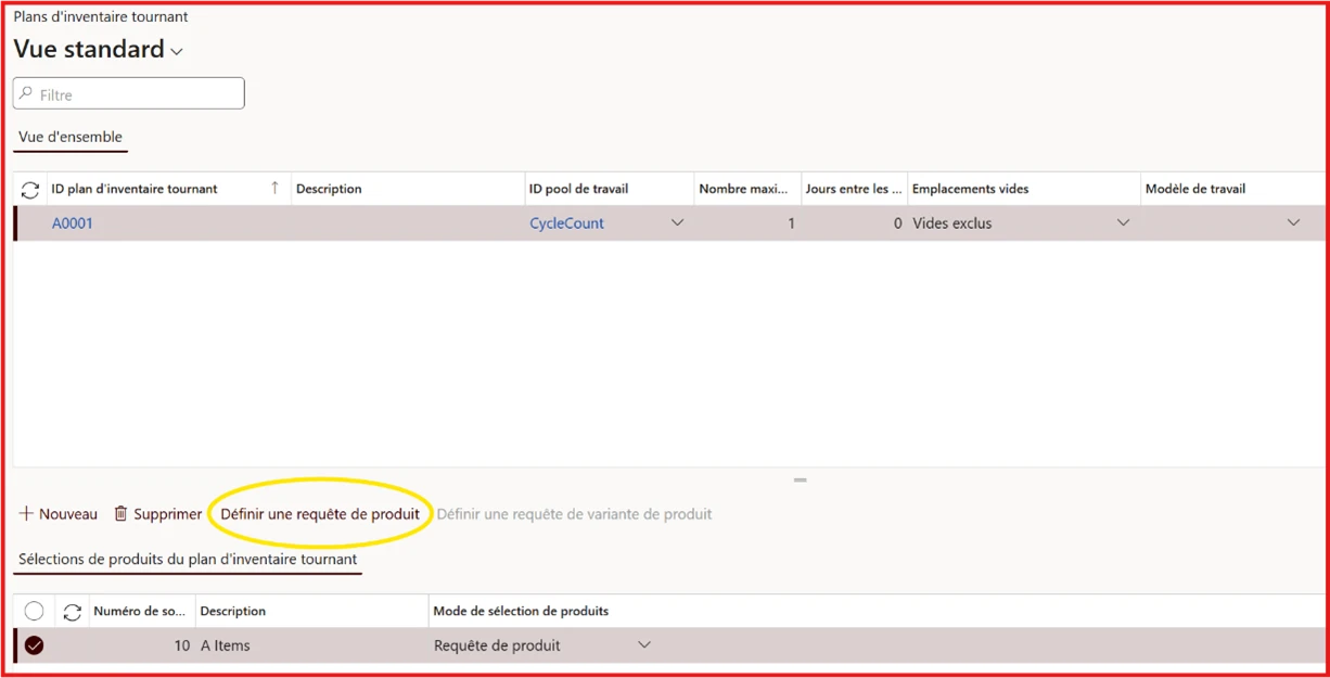 Pour toutes les autres configurations, bien que les interfaces diffèrent, le processus de configuration de l’inventaire tournant dans le module Gestion des entrepôts reste similaire (Gestion des entrepôts → Paramétrage → Inventaire tournant → Plans d’inventaire tournant). Les requêtes peuvent être créées à l’aide du bouton « Définir une requête de produit » :