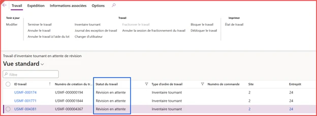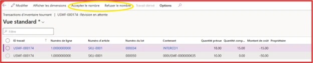 Dans le module Gestion des entrepôts, étant donné que le processus est automatisé, les informations sont accessibles au gestionnaire pour validation (Gestion des entrepôts → Travail → Entrepôt → Travail d’inventaire tournant en attente de révision) :