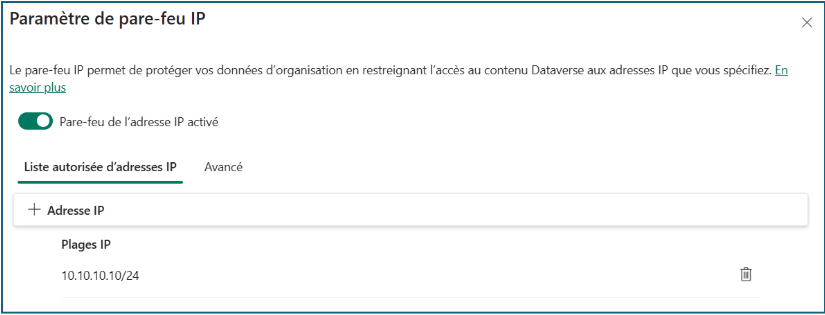 1. Activer le paramètre « Pare-feu de l’adresse IP » puis renseigner les informations concernant le ou les réseaux qui seront autorisés à se connecter aux environnements du groupe d’environnement.