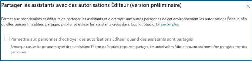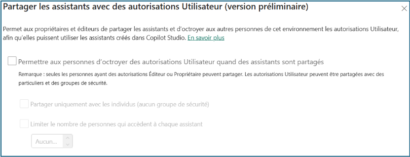 Cette fonctionnalité permet de restreindre le partage des assistants au sein d’un environnement, empêchant ainsi d’autres utilisateurs de les exploiter. Si Copilot Studio n’est pas utilisé, il est recommandé de bloquer ce type de partage pour éviter toute mauvaise manipulation ou utilisation inappropriée.