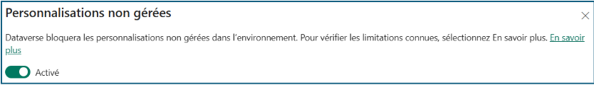 Cette fonctionnalité vérifie le contenu d’un environnement pour s’assurer que seules les solutions gérées sont exécutées. Elle garantit que le déploiement d’une solution passe par un processus automatisé et contrôlé, assurant ainsi que seules les solutions souhaitées et approuvées sont mises en place.