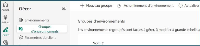 1. Accéder à un groupe d’environnement en allant dans la section « Gérer » puis « Groupes d’environnements » dans le bandeau latéral de gauche.