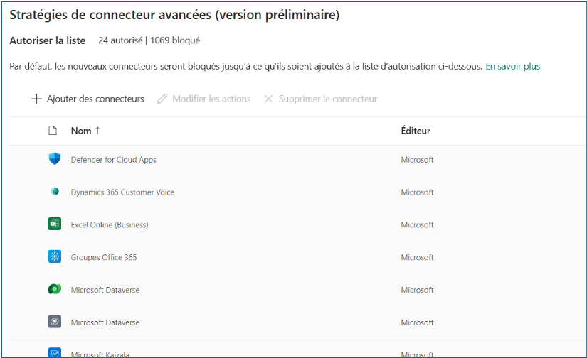Cette fonctionnalité permet de définir une liste de connecteurs autorisés pour l’ensemble des environnements appartenant à un groupe d’environnements.