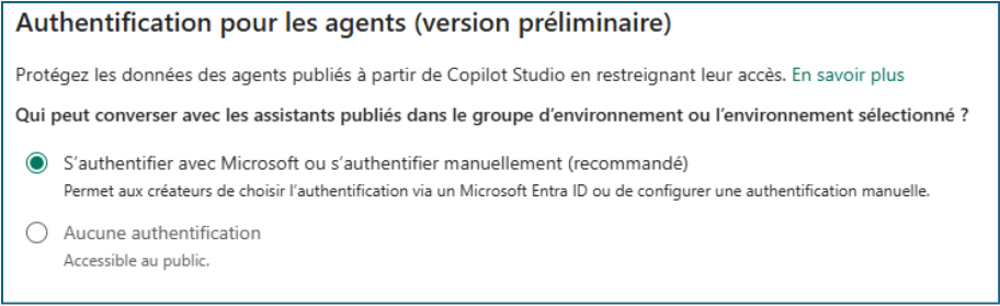Cette fonctionnalité permet de contrôler qui peut interagir avec un agent créé via Copilot Studio.