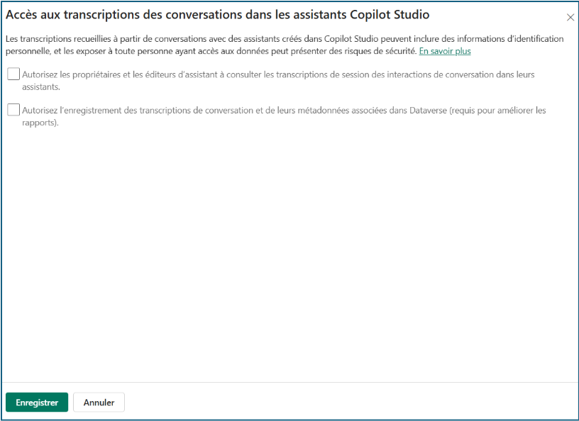 Lorsque le paramètre est activé, chaque fois qu’un utilisateur interagit avec un assistant Copilot, sa conversation est enregistrée dans le Dataverse de l’environnement. Ces conversations peuvent contenir des données sensibles et sont accessibles et téléchargeables par un administrateur.
