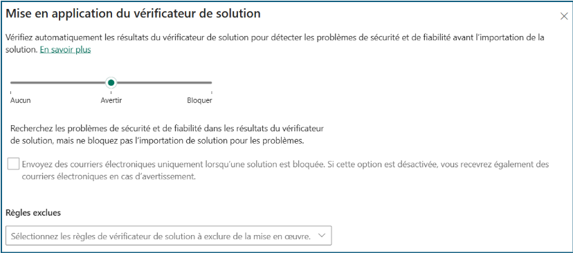 Pour cette règle, l’option « Avertir » est un bon choix car elle permet d’obtenir un résultat d’audit sans bloquer la mise en production. Cela signifie que vous serez informé des éventuels problèmes de sécurité sans que cela n’empêche l’importation de la solution.