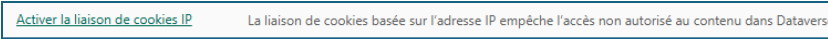 L’activation de la liaison des cookies permet de s’assurer que l’adresse IP présente dans le cookie de session correspond à celle du matériel utilisé par l’utilisateur. Si l’utilisateur change de réseau, il sera invité à s’authentifier de nouveau.